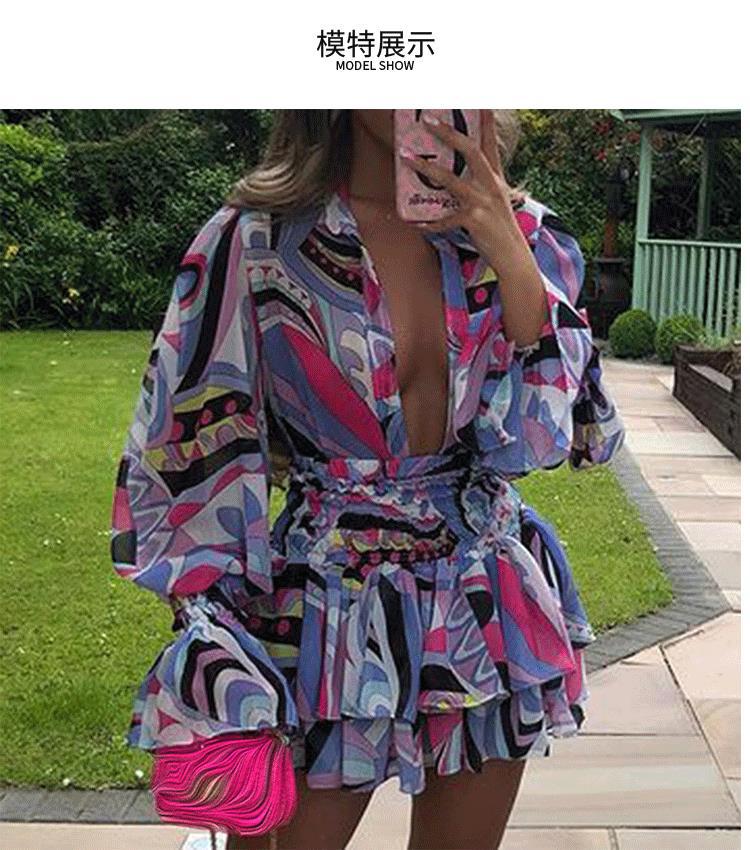 Cross-border Autumn Fashion V-neck Print Temperament Ruffle Short Dress
