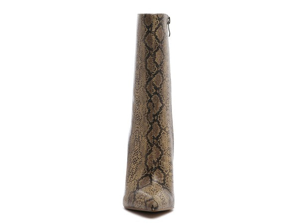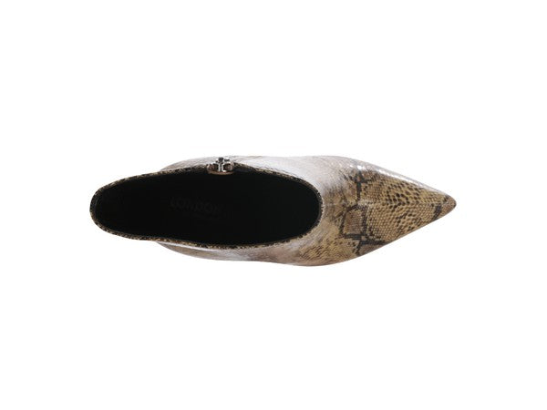 Sophisticated and versatile, this boot from London Rag will keep you feeling fierce. Pair this boot with anything from boyfriend jeans to a cocktail dress for an upgraded look.Type: BootsHeel Type: StilettoFaux LeatherSynthetic SolePointed toeZip fasteningSnake Print Style: Casual Closure: Zipper Made In: ChinaMaterial Composition: Faux Leather