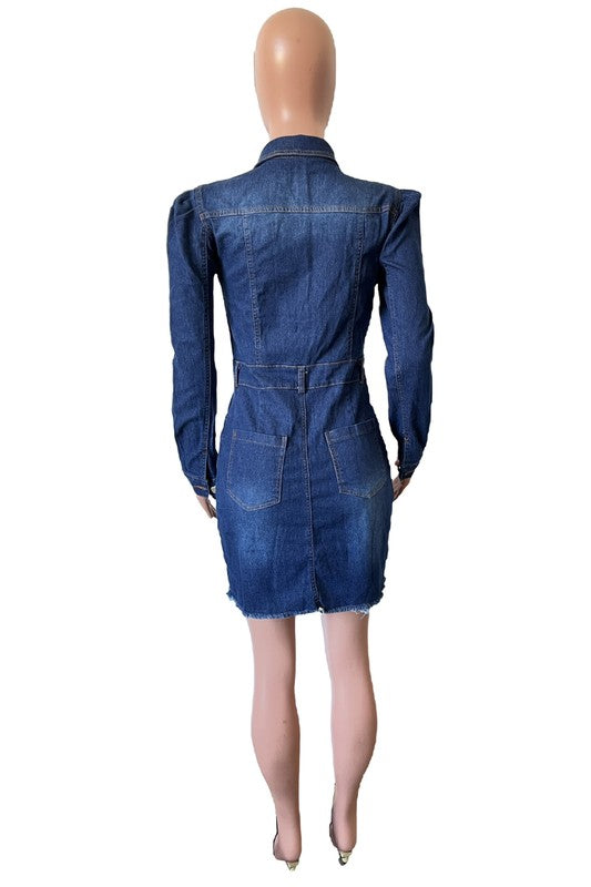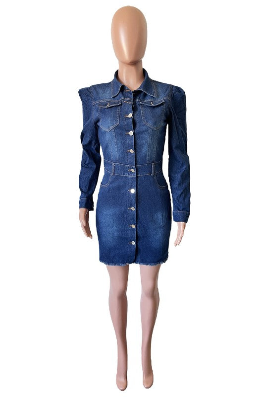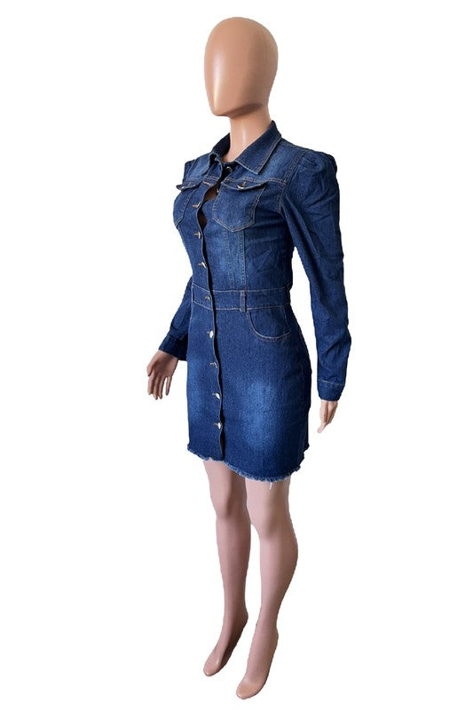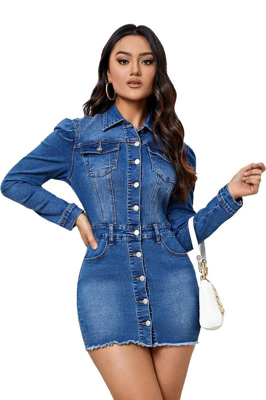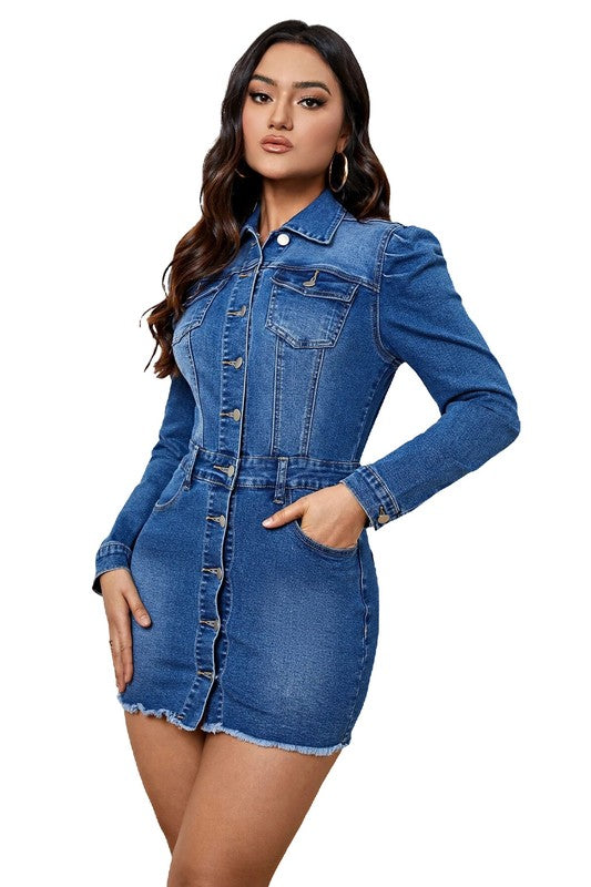 Fashion denim dress, long sleeves, Spread collar, Chest button-flap patch pockets, coin pocket front scoop pockets, back patch pockets